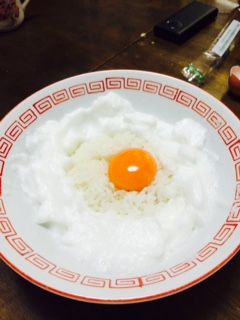 卵黄ば取って、卵白ばホイッパー?って言うとかいな?混ぜるヤツでメレンゲにしてご飯の上に卵黄ばのせて出来上がり!!